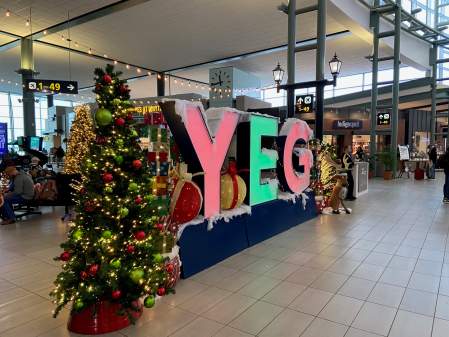 Edmonton’s airport said it’s doing its best to create a fun, relaxed holiday atmosphere with Christmas decorations, craft tables for kids, visits from Santa Claus, roving carollers, children’s choirs, therapy dogs and volunteer elves helping passengers unload their vehicles.