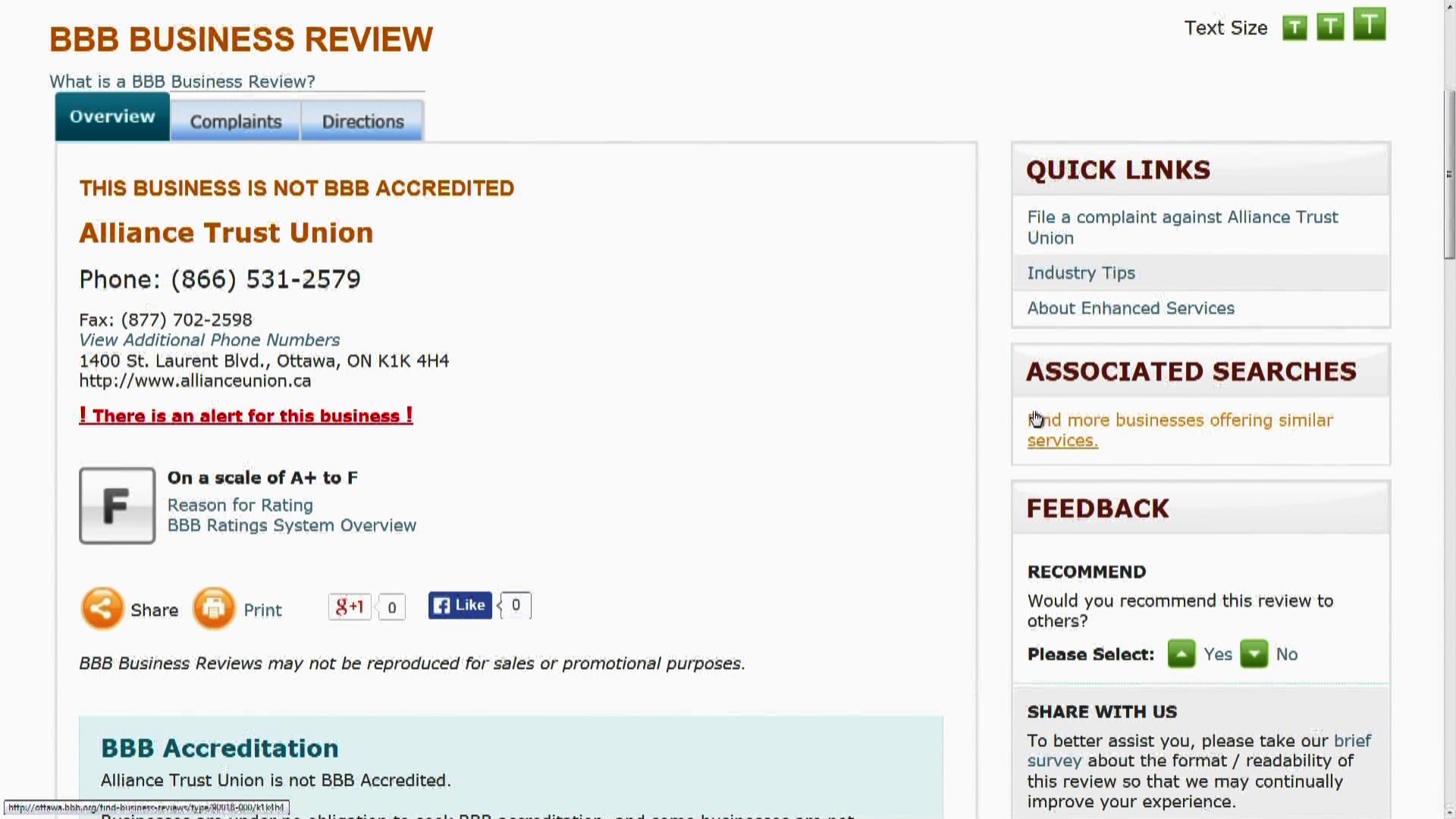 In fact, the BBB has issued an alert for Alliance Trust Union on their website.