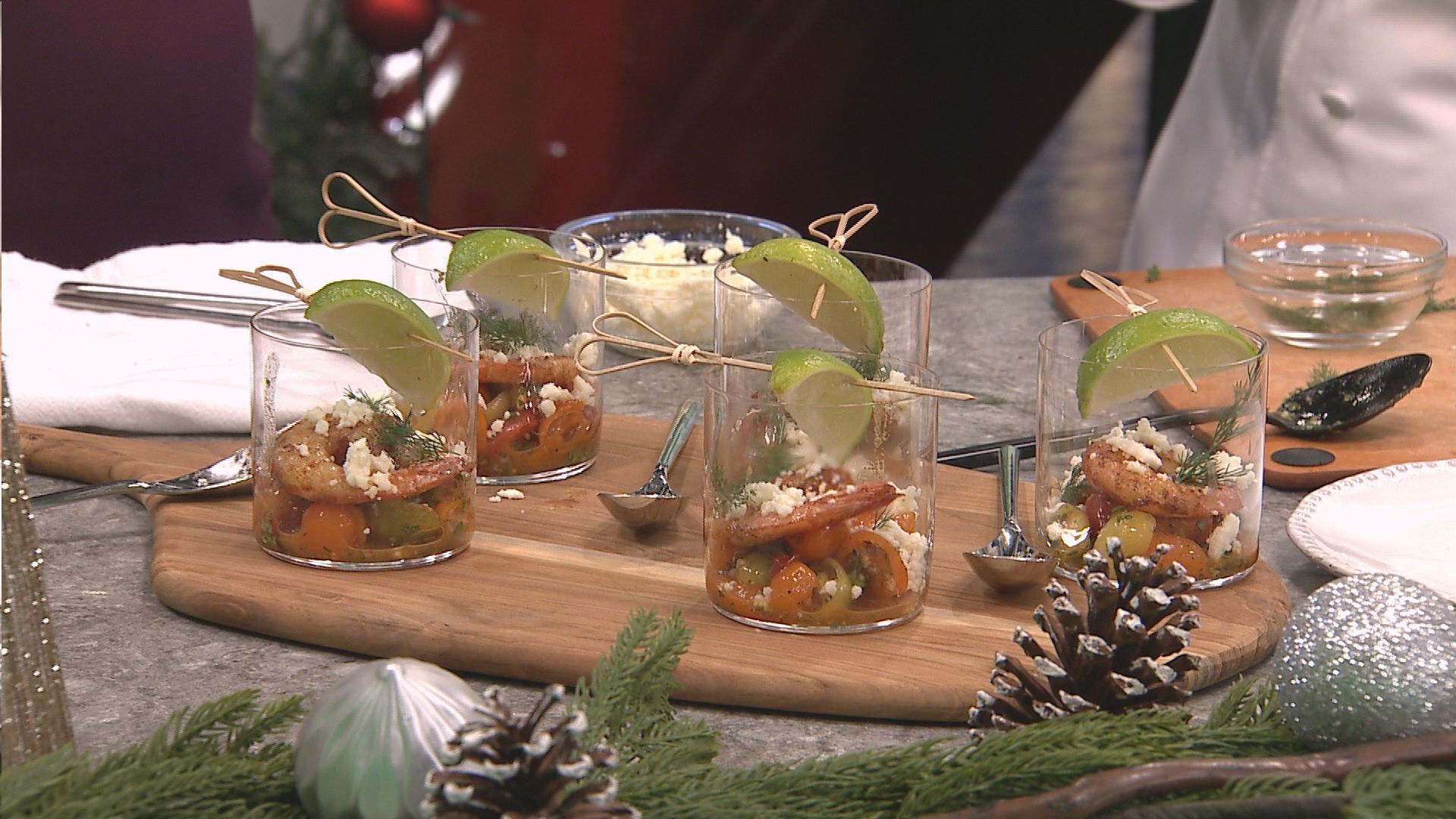 A step aside for a hand-held hors d’oeuvres, this is presented in a glass with a tequila-infused tomato base and topped with a seasoned grilled prawn.
