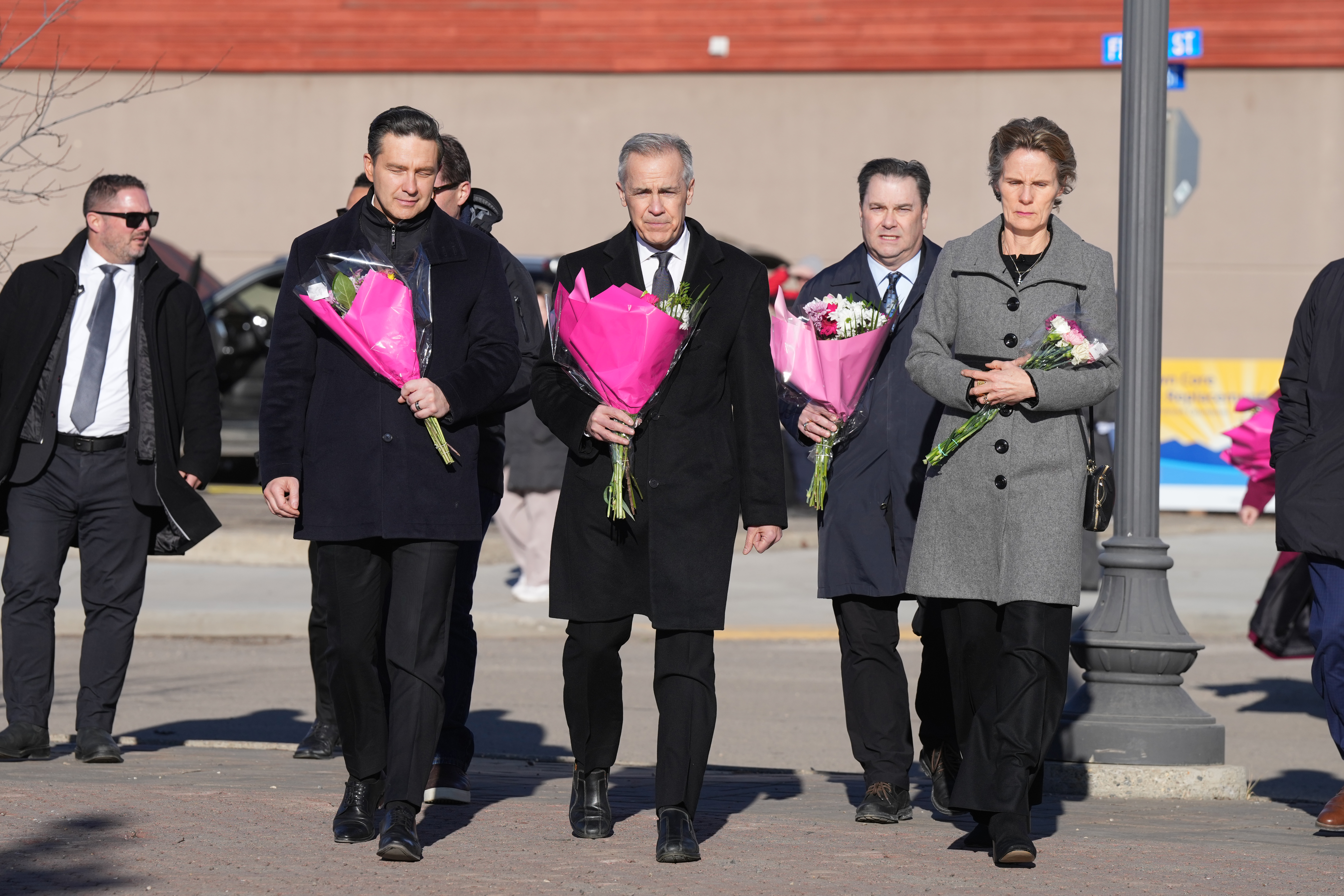 The prime minister, his wife Diana Fox Carney, the local member of Parliament Bob Zimmer and the party leaders — Conservative Leader Pierre Poilievre, Bloc Québecois Leader Yves-François Blanchet, NDP interim leader Don Davies and Green Party MP Elizabeth May — each laid flowers at a memorial honouring the eight people killed.