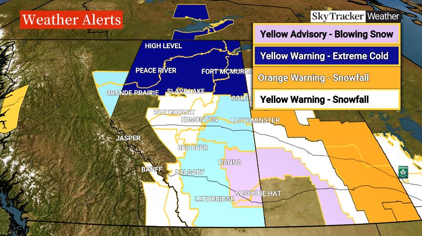 In Calgary, Lethbridge and much of southern Alberta, a winter storm warning was in effect Tuesday, with the high temperatures expected to hit just -15 C in Calgary and -17 C in Edmonton before plunging to -23 C overnight.