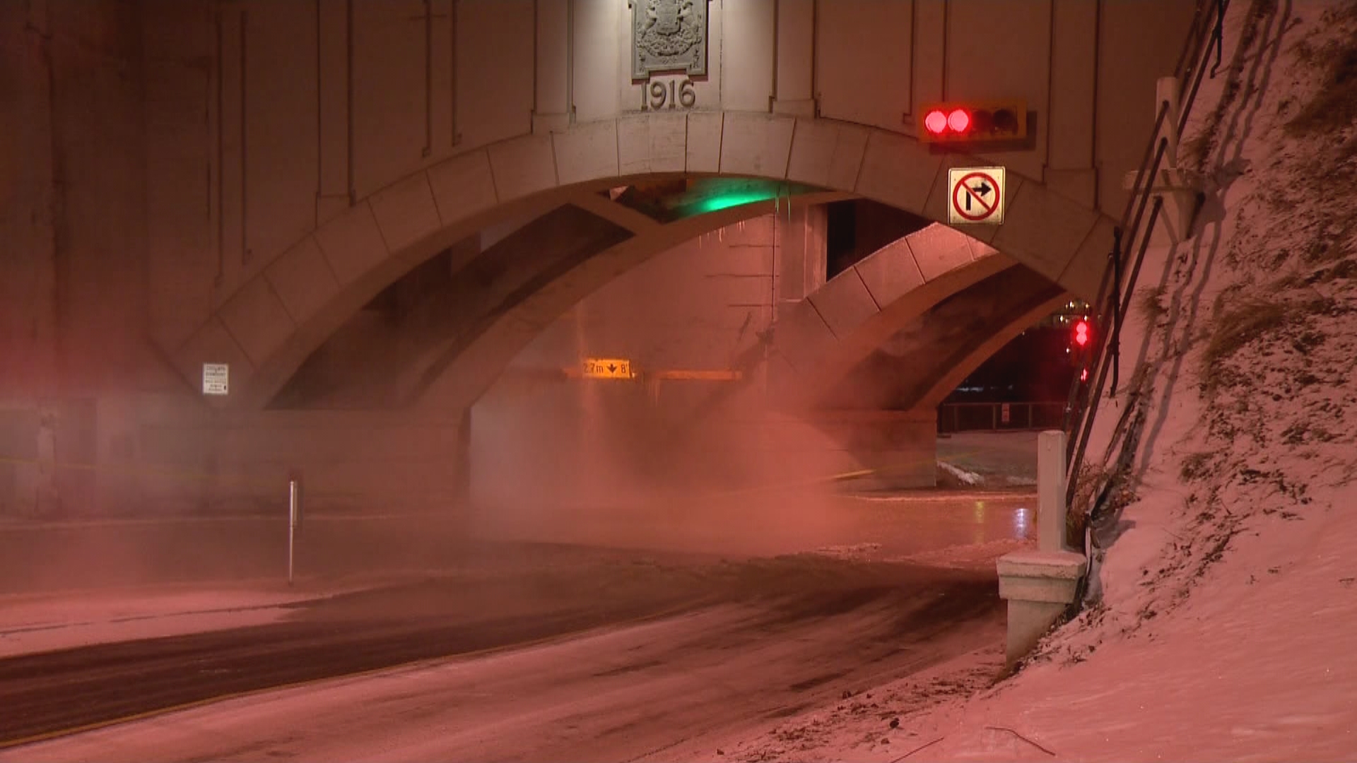 Earlier in the day, a water main broke on 8 Ave. N.W. at Centre Street, causing water to gush from the underside of Centre Street Bridge onto the road below.