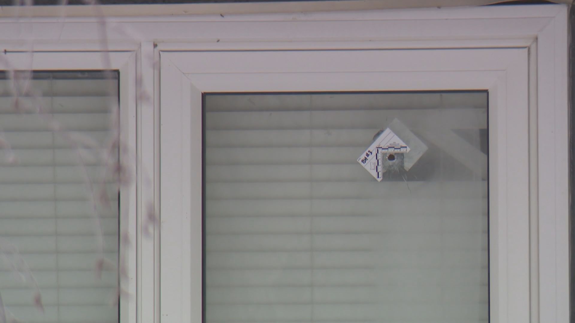 Thirteen bullet holes riddle a garage door along Saddleridge Drive, while broken glass sits on the front walkway from the shattered front door.