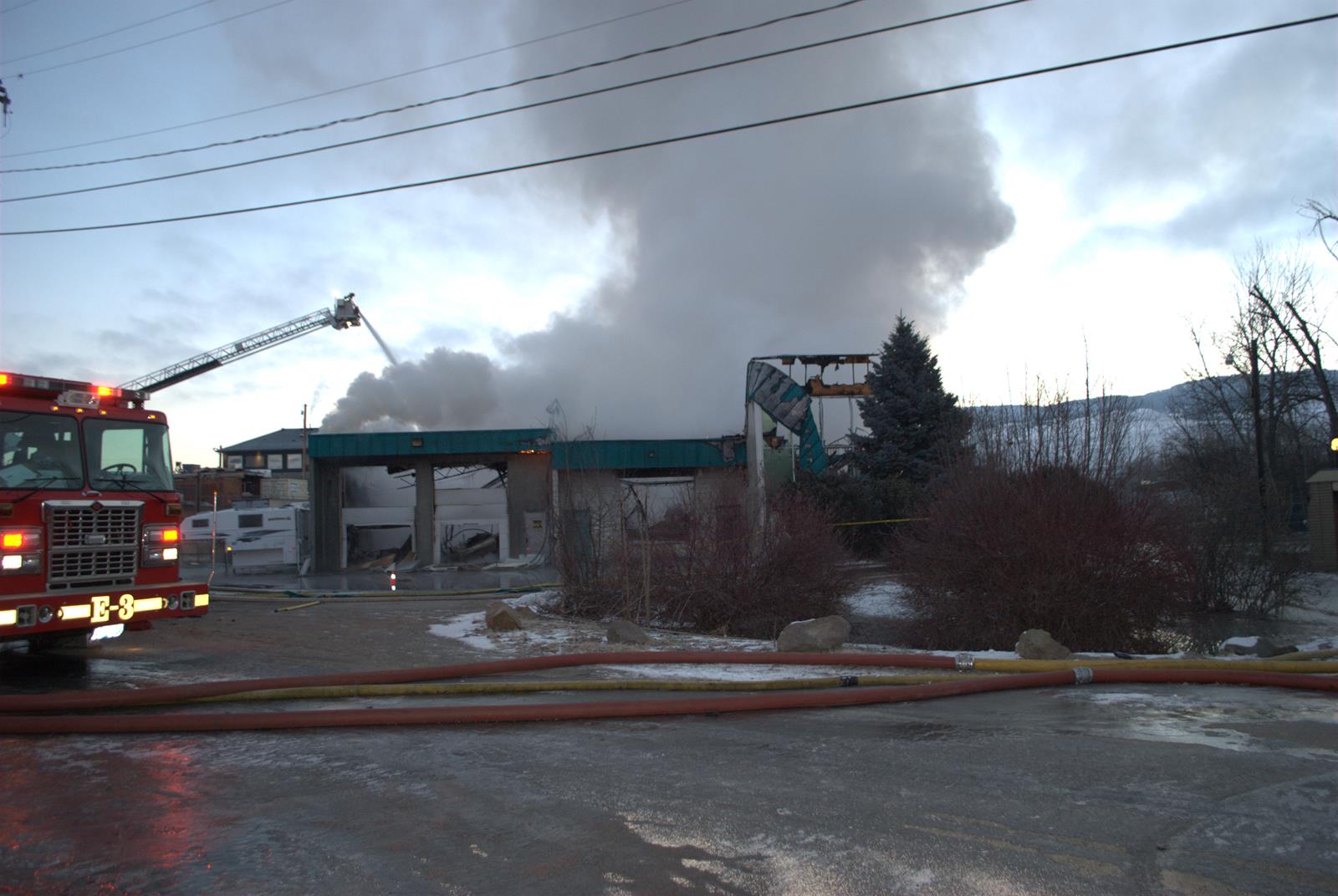 UPDATE: Kelowna fire officials say the smoke that is hanging over Kelowna from the structure fire is from fiberglass. Northern Lite makes campers. “The fiberglass that wraps on the campers gave us the most trouble,” says platoon captain, Tim Light.