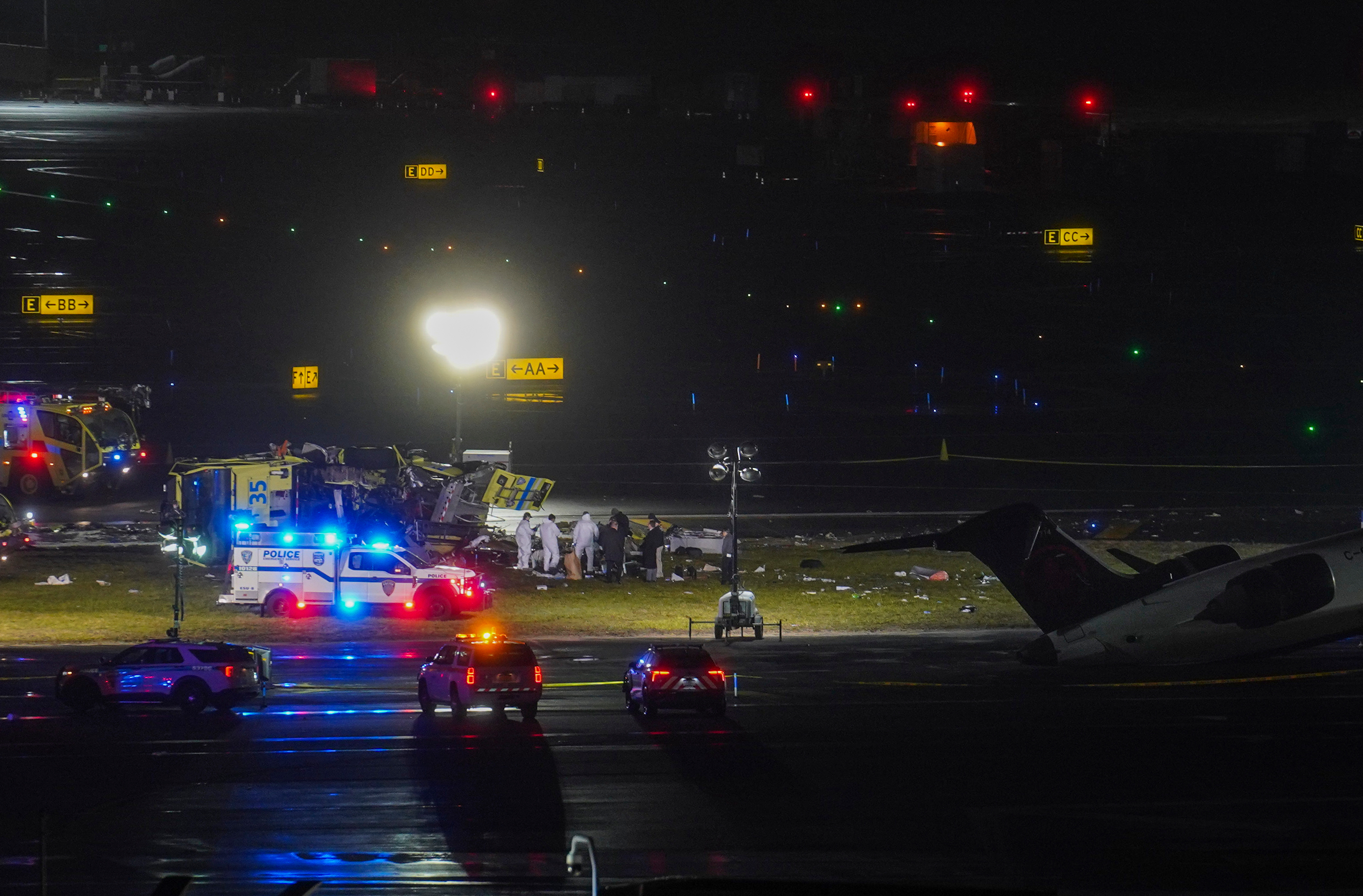 Photos from the scene showed severe damage to the front of the aircraft, with cables and debris hanging from a mangled cockpit. Nearby, a damaged emergency vehicle was on its side.