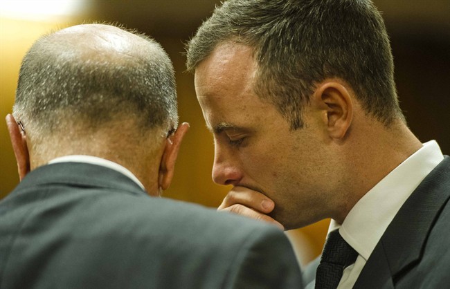 PRETORIA, South Africa – During breaks in his murder trial, Oscar Pistorius sometimes confers intensely with his camp, murmuring in the ear of his chief defence lawyer. When witnesses testify, the double-amputee athlete takes notes or sits with hands clasped, occasionally covering his face, head bowed, as though troubled by the graphic accounts of how he fatally shot his girlfriend last year.