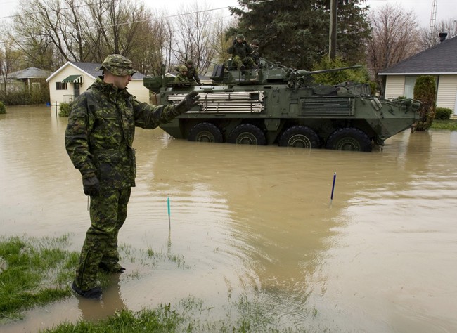 <p>MONTREAL – Another 100 soldiers have been brought in today to help the victims of a massive flood south of Montreal.</p> <p>There are now 800 troops working in the Monteregie region, where more than 20 municipalities are affected by the flooding.</p> <p>The soldiers are using inflatable boats to rescue stranded residents and sandbags to control the water. </p> <p>Flood levels on the Richelieu River dropped slightly overnight but there are still about 3,000 homes flooded and about 1,000 people have been forced to leave their homes.</p> <p>Authorities say they don’t expect major changes in flood levels before the beginning of next week.</p> <p>There is also concern that waters are rising sharply in parts of central Quebec, which had previously been hit less heavily than the area near the U.S. border.</p>
