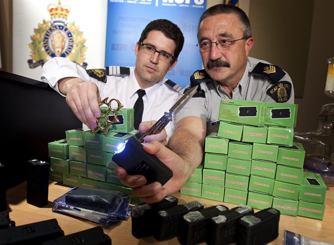 <p>CALGARY – The RCMP and Canada Border Services Agency have intercepted four shipments of prohibited weapons, including stun guns, that were destined for a Calgary address after being shipped out of China.</p> <p>Border services staff say the first shipment was discovered in Vancouver at the end of March. The goods were declared as LED lights but instead contained stun guns, brass knuckles and butterfly knives. All are considered prohibited weapons in Canada.</p> <p>Three other shipments followed, leading to the seizure of a total of 89 prohibited weapons, including 50 stun guns, which can discharge up to 50,000 volts.</p> <p>”These came out of the box fully charged,” said RCMP Sgt. Patrick Webb as the stun guns were fired up and issued sparks and a loud crackle at a news conference Monday afternoon.</p> <p>”The most important point to remember here is that these are a lot of weapons that are not going to be on the streets of Calgary or the streets of Alberta because there’s no way that any one individual would want this type of material,” said Webb.</p> <p>”These are for sale. These would be ending up in the hands of people that would be using them around our communities.”</p> <p>Webb said the stun guns would retail for about $100 on the street. He said he couldn’t say if the weapons were destined for organized crime, but added they were likely to be used in a bar fight or in the commission of a crime.</p> <p>An official with border services says people would be surprised at how often prohibited weapons are ordered off the Internet and shipped into Canada. The four shipments came from China, but there are a number of countries where they can be purchased, said Richard Cuzzetto, manager of criminal investigations.</p> <p>”I can’t speak specifically to conducted energy weapons (stun guns) but I can say in the last five years CBSA has intercepted over 16,000 prohibited weapons in total – that’s an average of over eight per day,” he said.</p> <p>”This is the largest seizure of these types of weapons in Alberta this year. But there have been other years where you might have a seizure involving hundreds of prohibited weapons.”</p> <p>Kyle Gibbons, 20, of Calgary faces 17 charges, including possession of a prohibited weapon for the purpose of trafficking, smuggling and importation of prohibited weapons.</p> <p>Cameron Powell, 46, also of Calgary, has been charged with possession of a controlled substance.</p> <p>A large amount of cash as well as drugs and drug paraphernalia were also seized.</p> <p>Police say more charges are pending.</p>