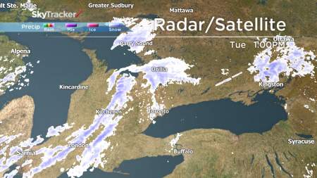 A band of snow is moving from southwestern Ontario south toward Lake Ontario. As of 2:30 p.m., it had moved through London. The band extends toward the Barrie and Orillia area.