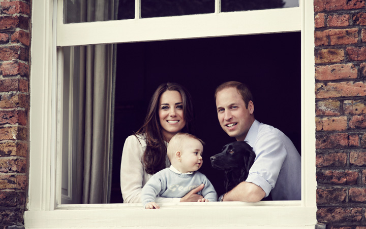 The photograph is a departure from traditional royal family portraits, with the family appearing casual as they look out one of their windows in apartment 1A at Kensington Palace. Prince George, looking much bigger since the last official photo we saw of him at his christening, is adorable in a sweater that has his name on it as he stares at the family’s dog Lupo.