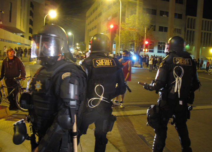 Richard Berry said Sunday that one officer was injured, rocks were thrown and at one point protesters trapped police in a vehicle and tried to break the windows, the Albuquerque Journal reported (http://bit.ly/1lxuypl). An Associated Press reporter saw gas canisters being thrown outside police headquarters and Albuquerque police and Bernalillo County sheriff’s deputies charging at the protesters late Sunday, which mostly dispersed the crowds.