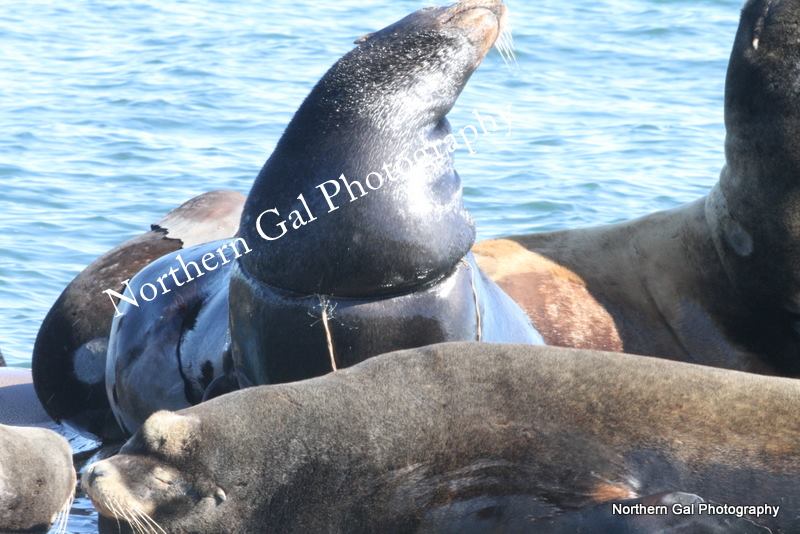 Kiyo the sea lion was first sighted in the area in February and has its neck wrapped up twice by the line that is now penetrating his skin.