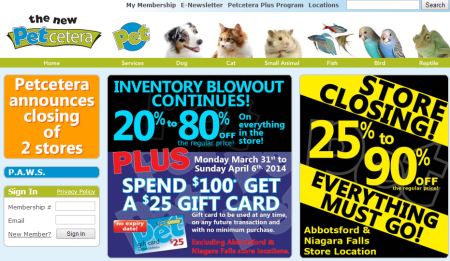 Petcetera says inventory in the Niagara Falls and Abbotsford locations will be liquidated at discounts ranging from 25 per cent to 90 per cent.