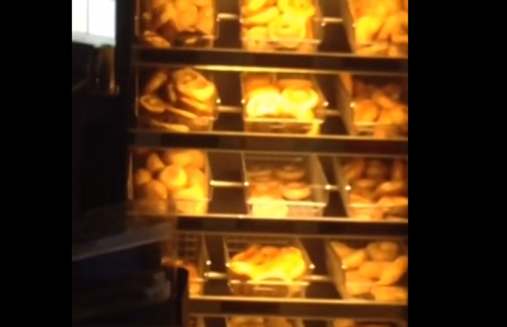The footage shows the rodent crawling through the racks of assorted pastries.