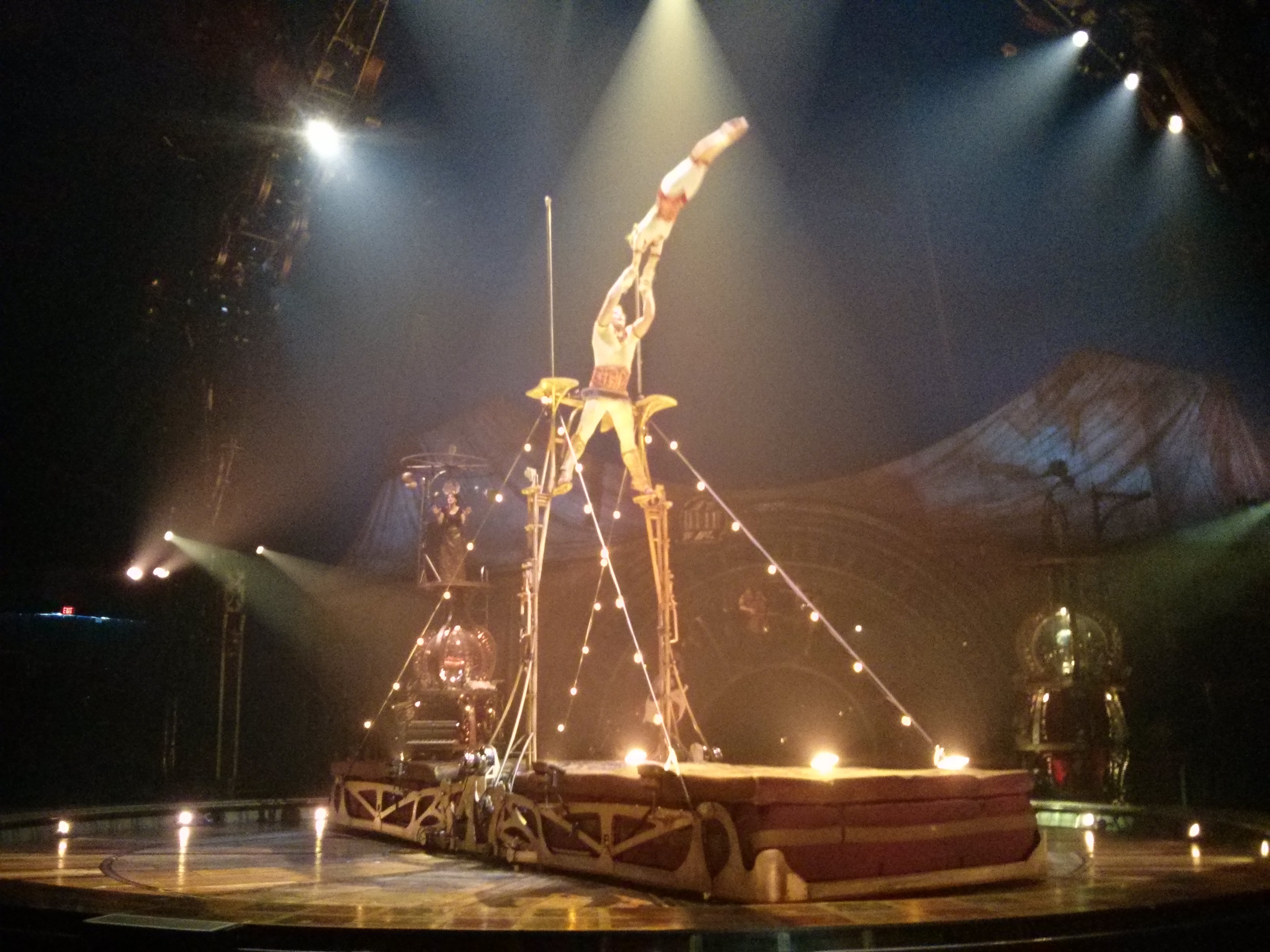 One of the production’s centrepieces is a high-flying performance of what is known as rolla bolla, a balancing act that involves flat surfaces and cylinders. Cirque du Soleil added a twist – performing rolla bolla tens of meters in the air.