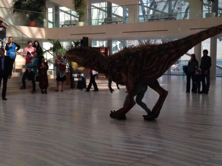 Monday morning, a baby T-Rex was roaming around City Hall to preview the show. The life-sized dino put on quite the show for a group of school children, and Mayor Don Iveson.