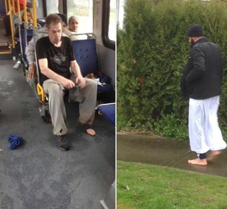 Sitting near the front of the No. 341 bus to Guildford, he noticed a barefoot man sitting near him.