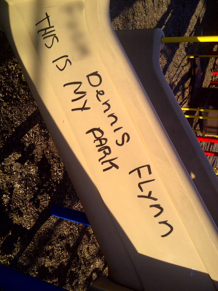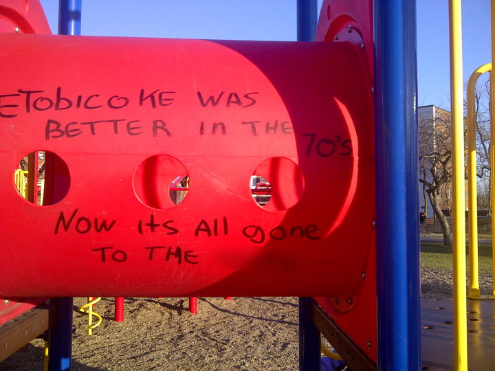 TORONTO – Police are investigating after the playground of Dennis Flynn Park was vandalized with what they call mischievous, hateful and racist graffiti.