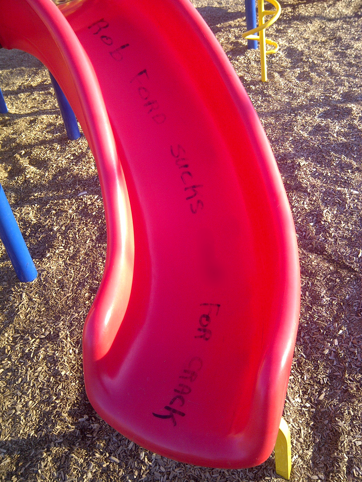 Most of the graffiti is being labeled by police as criminal mischief, including one that reads “Rob Ford smoked crack.”