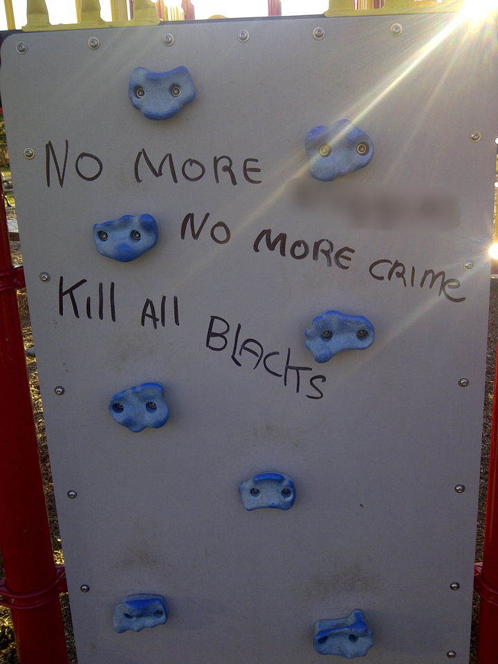 “No more N****rs. No more crime. Kill all Blacks” was written in what appears to be permanent marker across a children’s climbing wall.