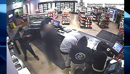 On Feb. 14, five suspects filled up their car at a gas station before entering the gas station wearing balaclavas.