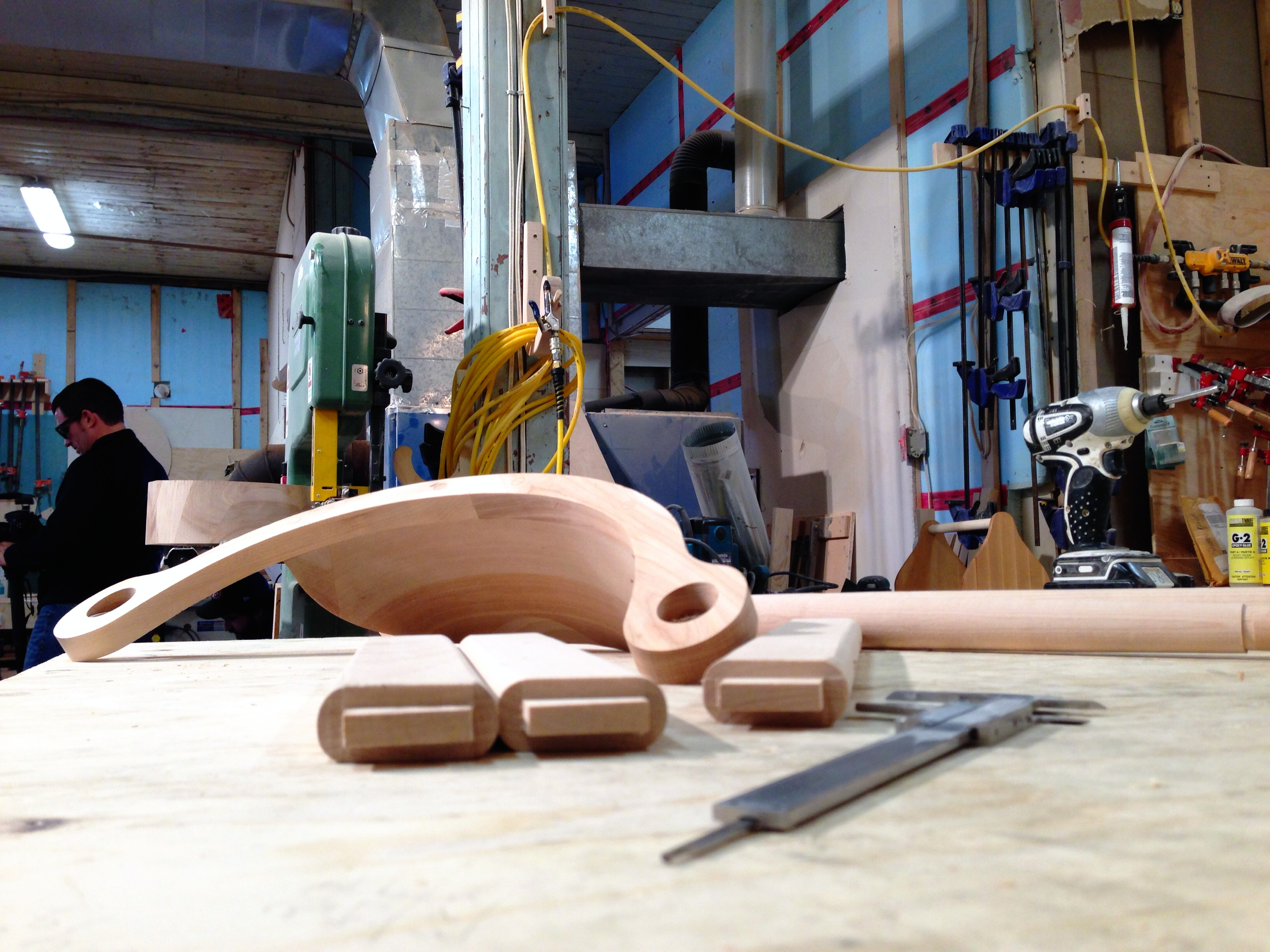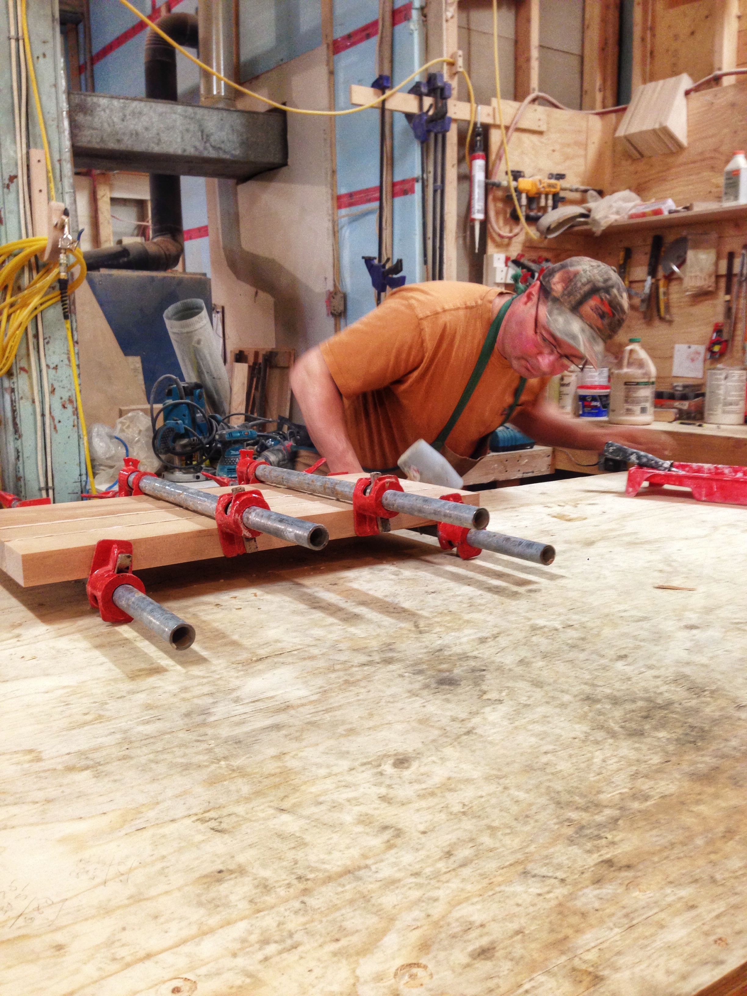 Earl Cull and Guy Freake are each at a station, heads down, focused on furniture they are building that will soon find a home at the Inn.