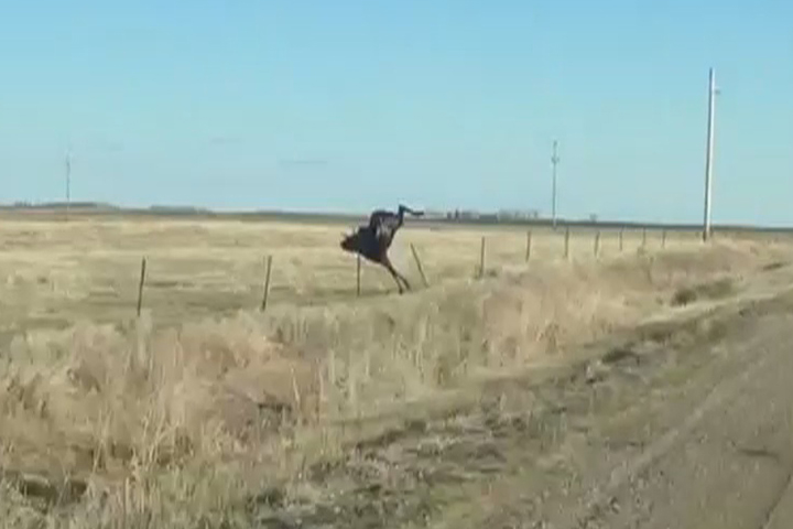 A moose in North Dakota needs to work on its vertical leap after a failed attempt to jump over a roadside fence was caught on camera.