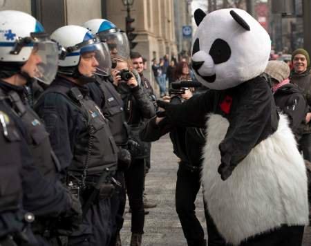 Speaking at the event are several victims of police violence, including Francis Grenier, who lost an eye during the student protests in March 2012, Maxence Valade, who also lost an eye during demonstrations in Victoriaville the same year, Anarchopanda, who was decapitated during a protest in April 2013, and former Centennial Regional High School history teacher Robert Fransham.