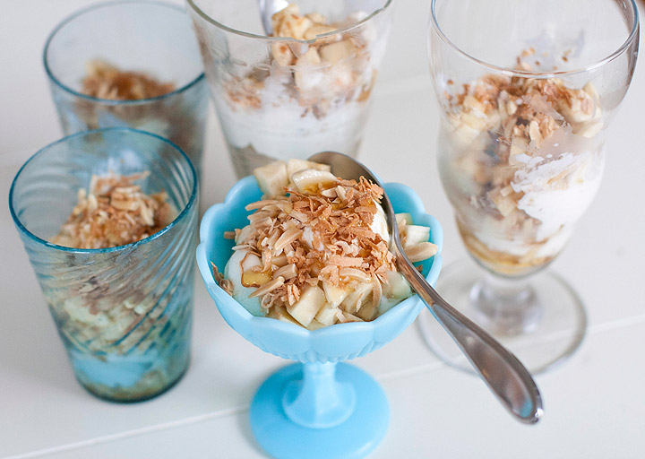 To assemble the parfaits, add a teaspoon of coconut and almonds to the bottom of each parfait glass. Top with a tablespoon of banana and a drizzle of honey. Add a scoop of vanilla ice cream. Continue layering in this order until you’ve used all the ingredients and filled the glass. Serve immediately.