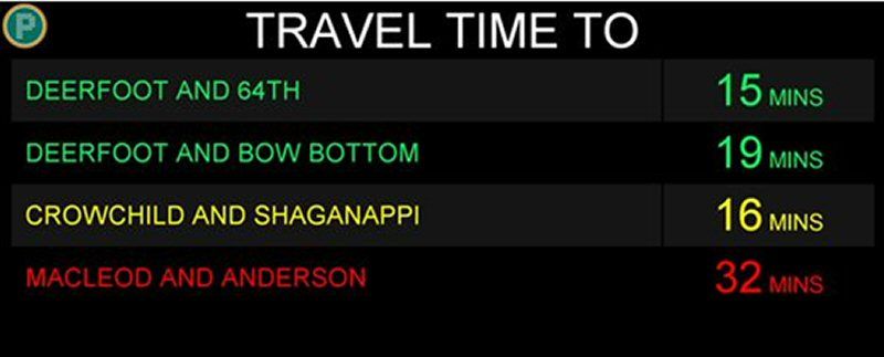 The screens, at six of the seven parkades run by the Calgary Parking Authority (CPA), give drivers estimated commute times to a number of key intersections on Deerfoot Trail, Crowchild Trail and Macleod Trail.