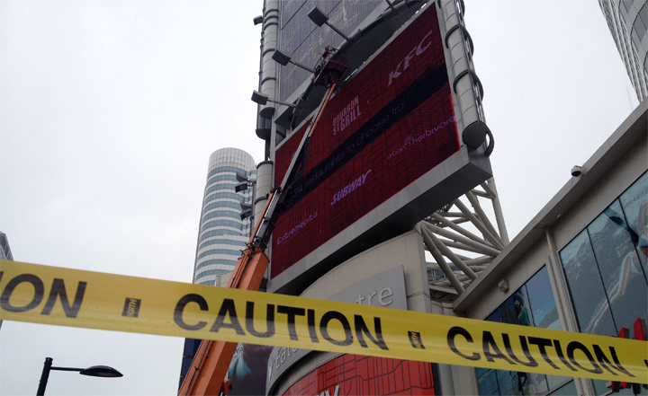 TORONTO – A man was hurt Tuesday after being struck by a piece of a billboard that had fallen at Yonge and Dundas Square.