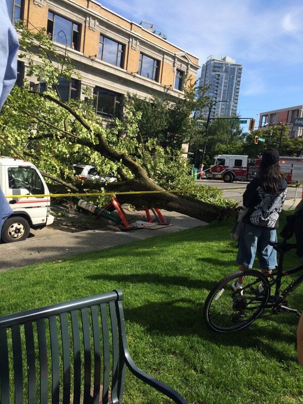 The tree, a large Sycamore Maple estimated to be 70 years old and about 50 feet tall, fell on West Pender Street at Cambie Street at Victory Square around 4:30 p.m. It hit a support pole for trolley wires, causing them to fall on to two vehicles.