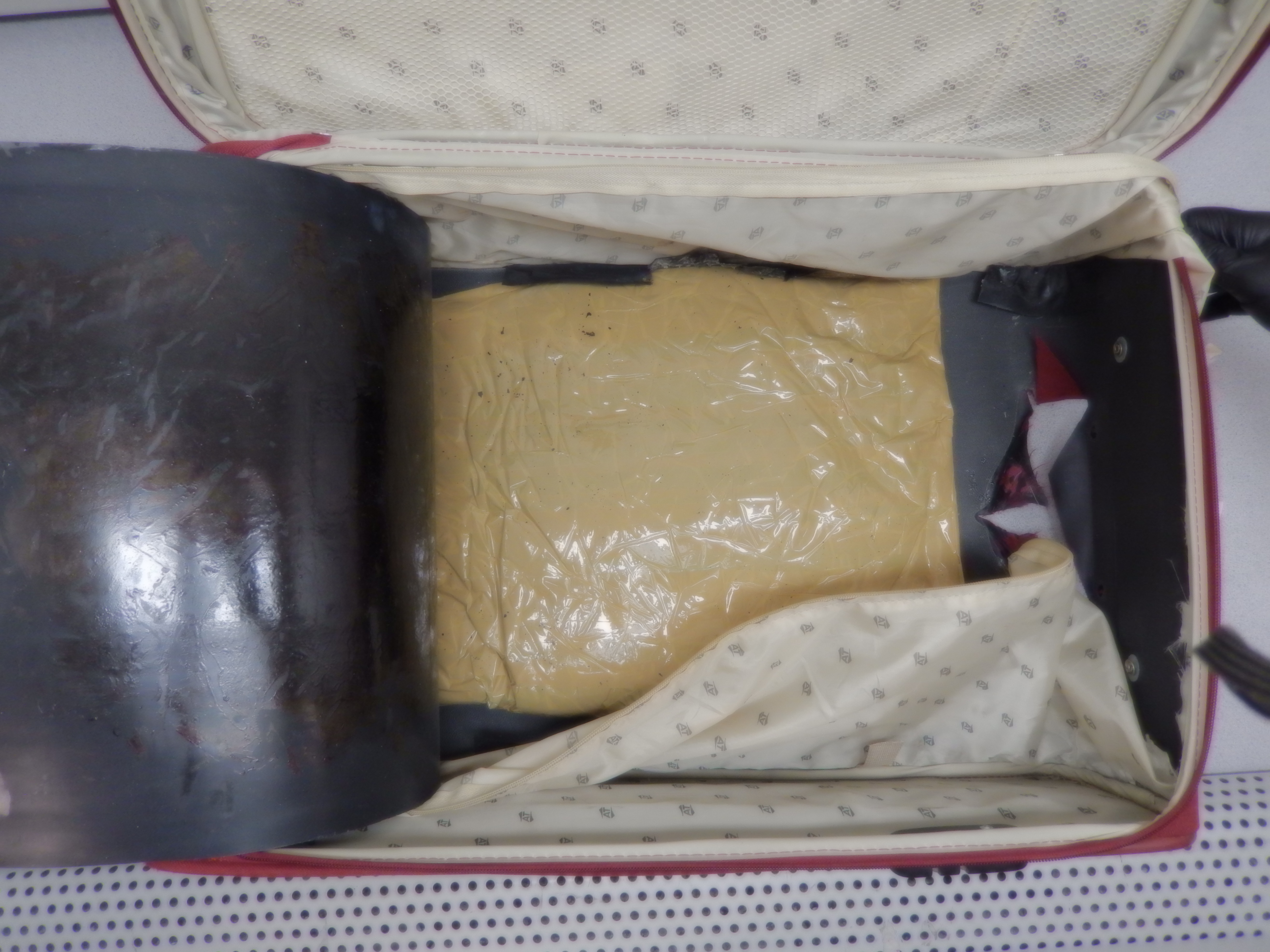 They found the suitcase had a false bottom, and discovered over six pounds of narcotics inside.