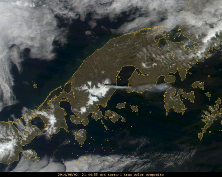 The ash plume from the volcano reached about seven kilometres above sea level and extends over 80 km southeast of the volcano.