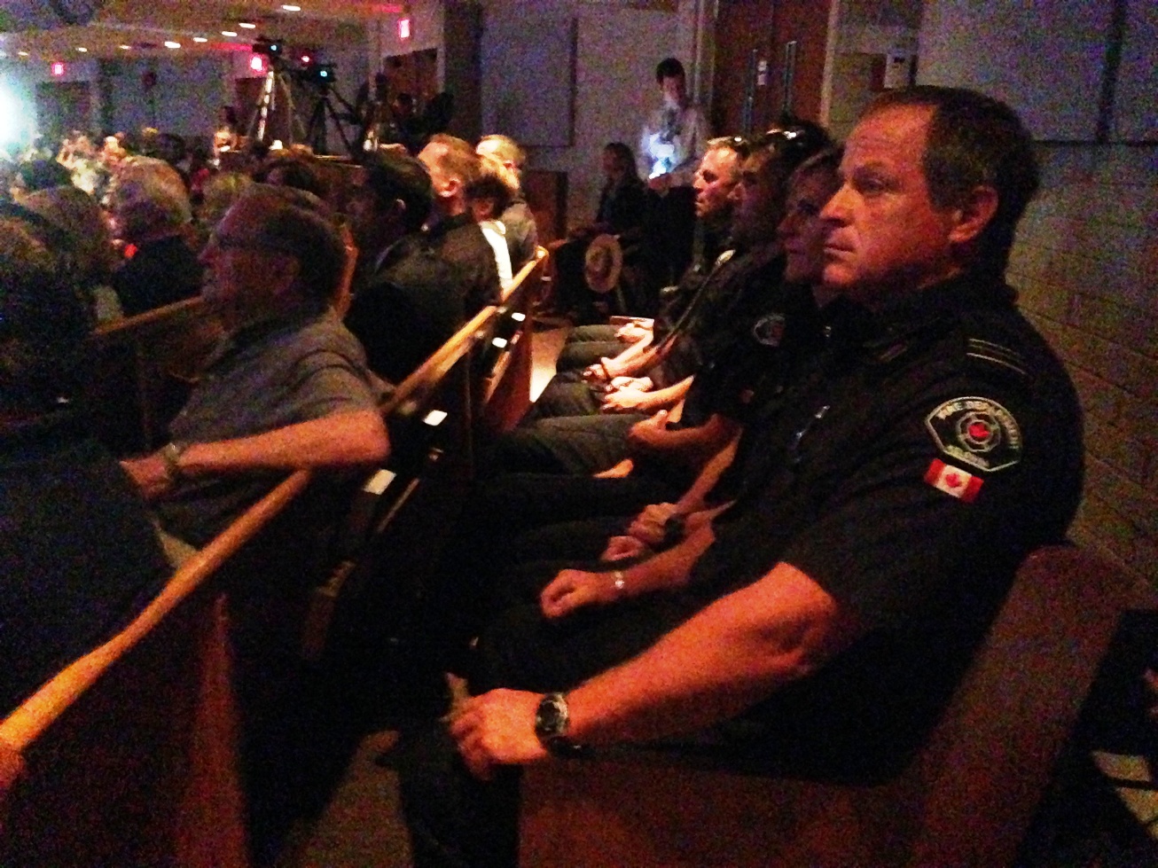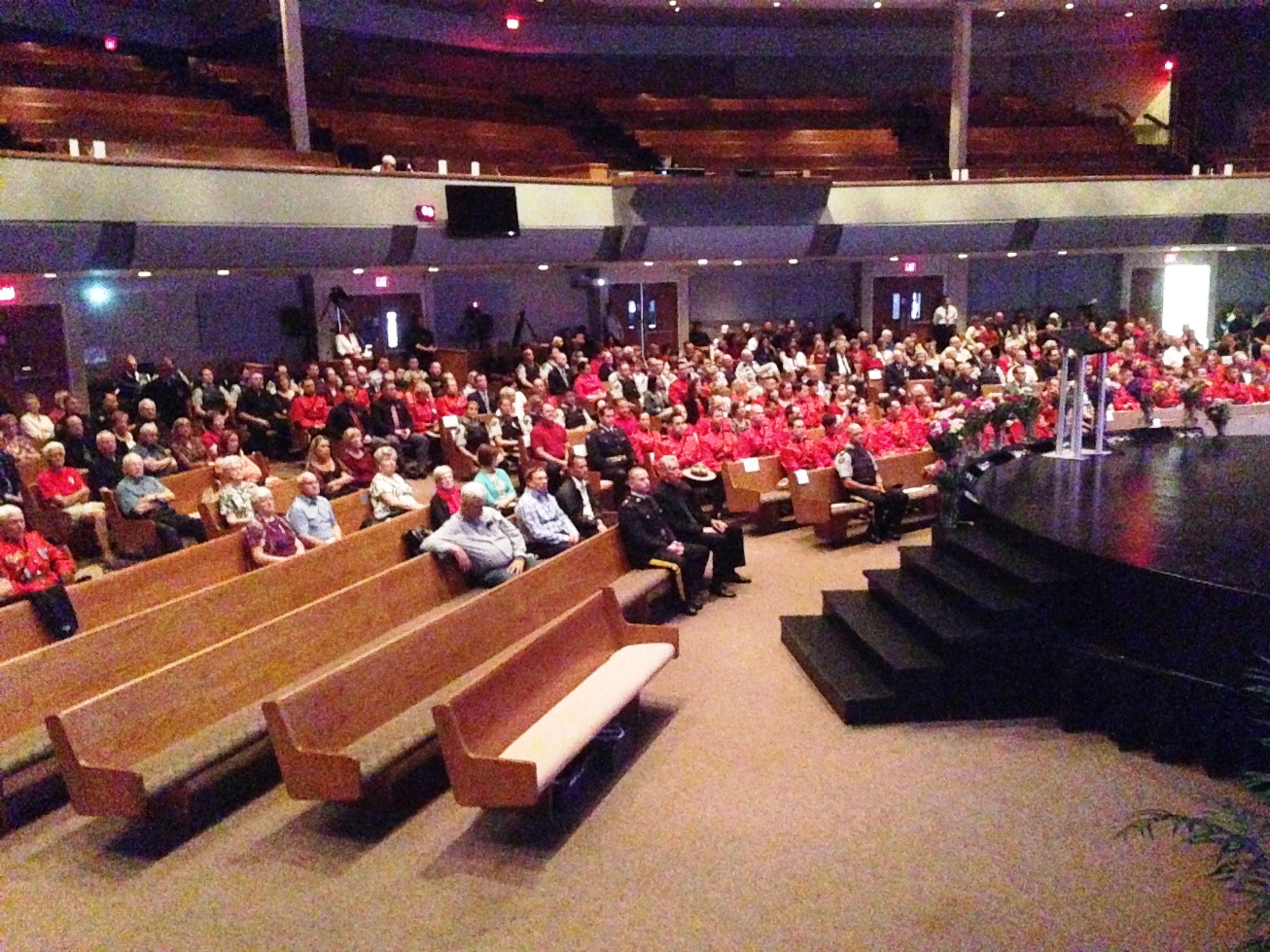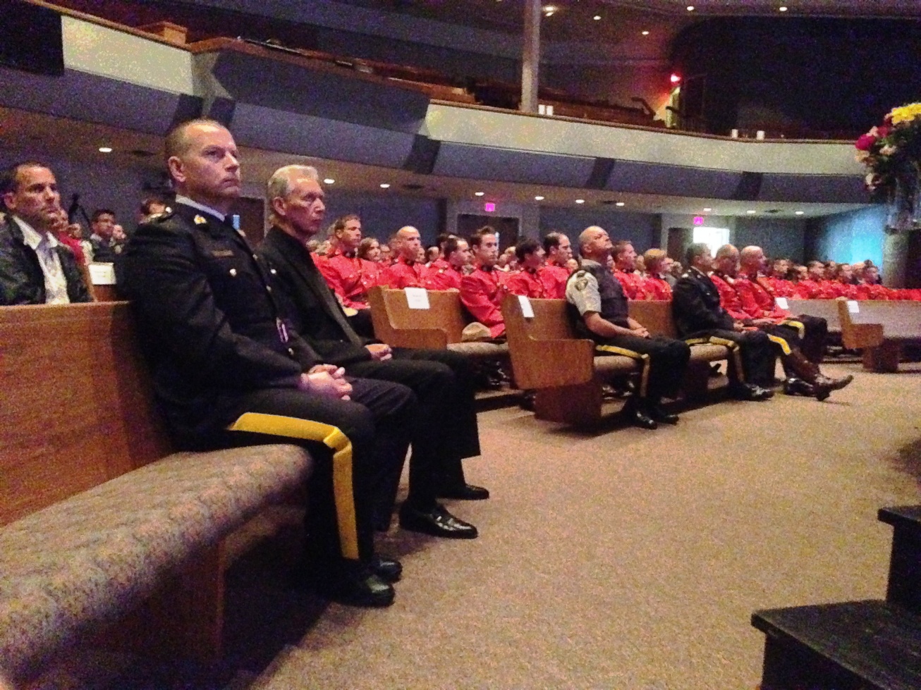 More than 200 off duty RCMP officers, fire department personnel and paramedics filled Trinity Baptist Church for a local ceremony and viewing of the ceremony taking place in Moncton.