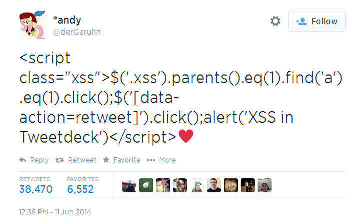 Users began experiencing strange pop-up messages when using the real-time Twitter tracking tool Wednesday. Affected accounts also re-tweeted a cross-site scripting (XSS) code sent out by the Twitter account @derGeruhn as a result of the vulnerability. That tweet has since been re-tweeted over 38,000 times.