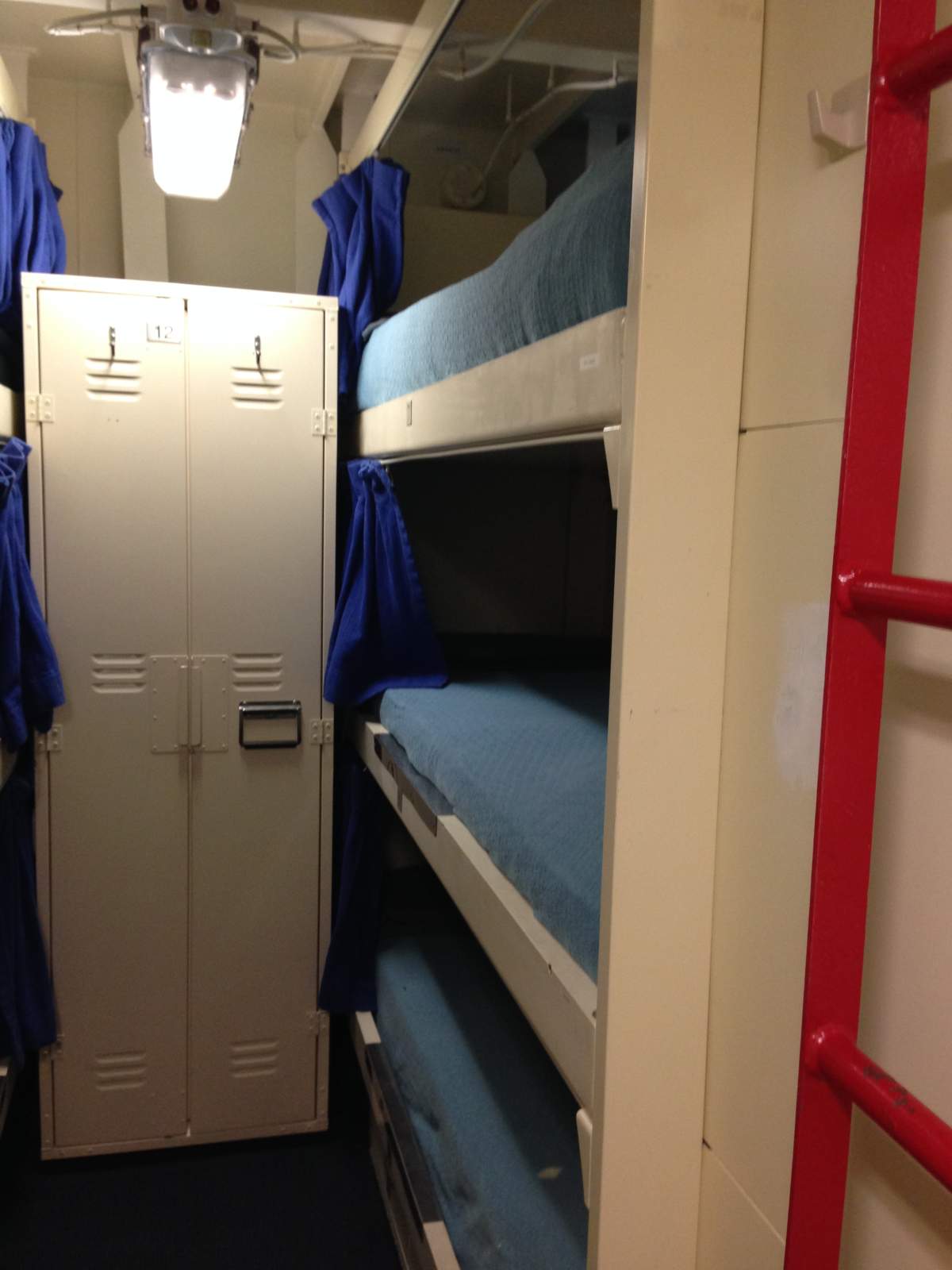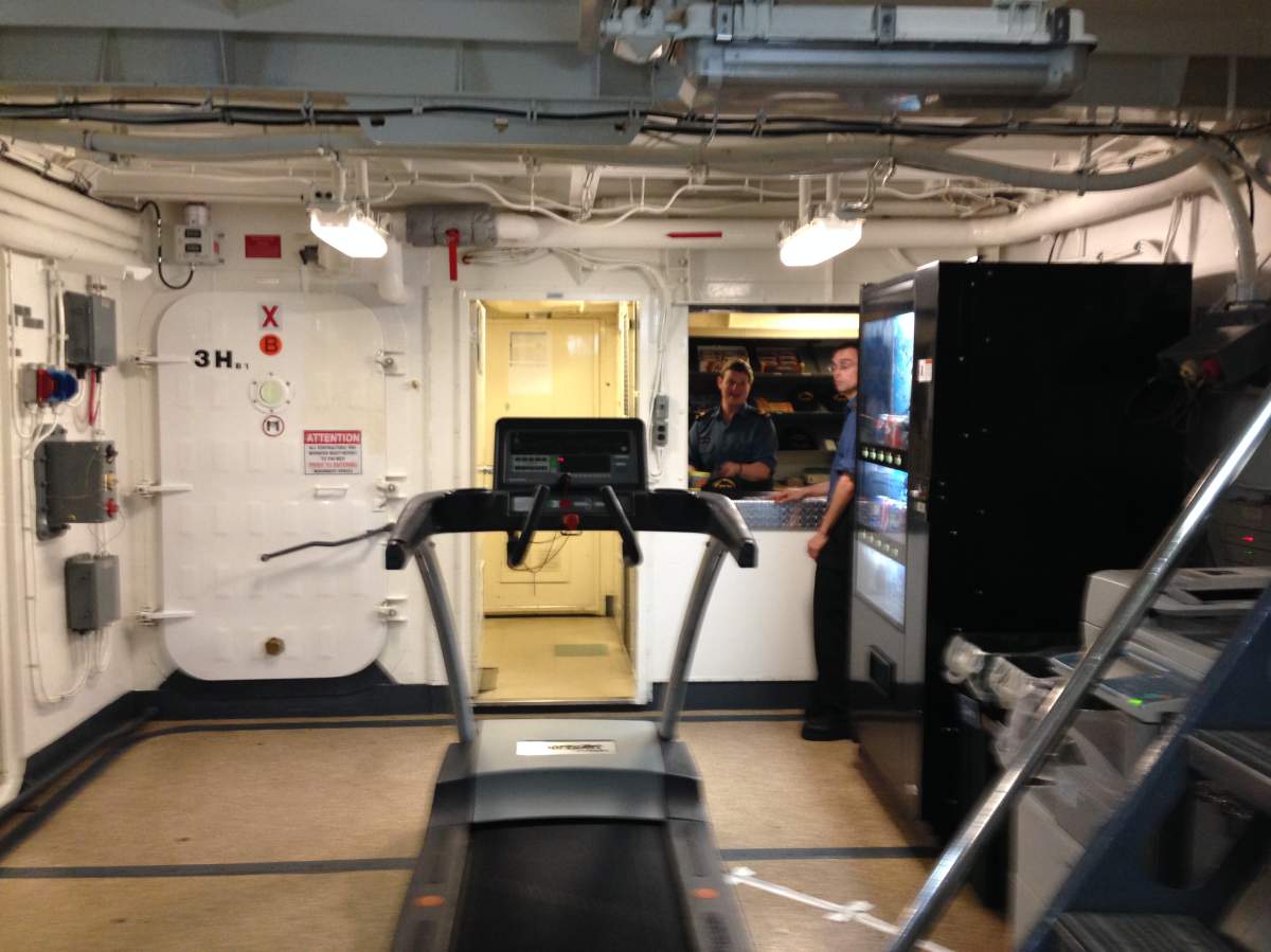 Heading into the bowels of the 150 metre-long ship that holds 235 sailors, it’s hard not to notice their efficient use of space, their small sleeping quarters, the lack of natural light, and the exercise equipment like stationary bikes and treadmills scattered anywhere they will fit.