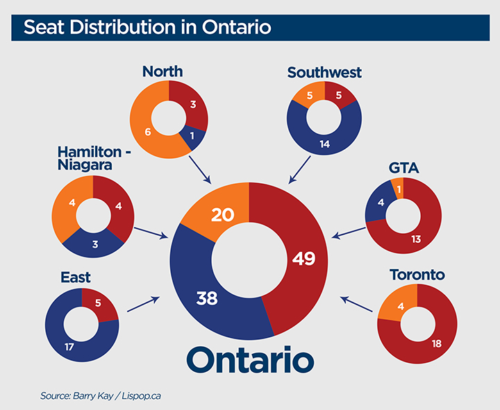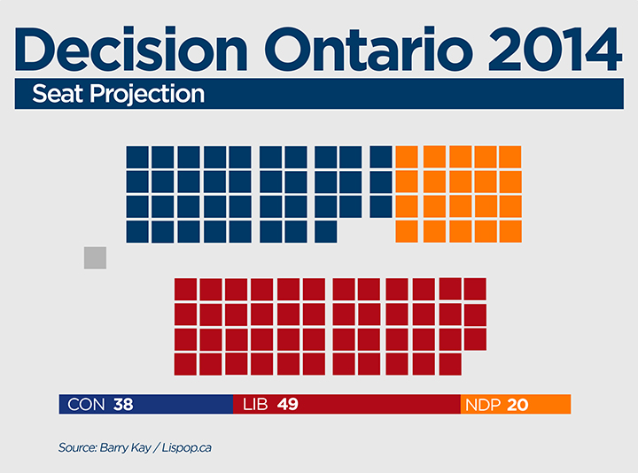 If the Lispop.ca aggregation holds true through election day, Ontario would once again have a Liberal minority government, with 49 seats – ten more than the Progressive Conservatives.