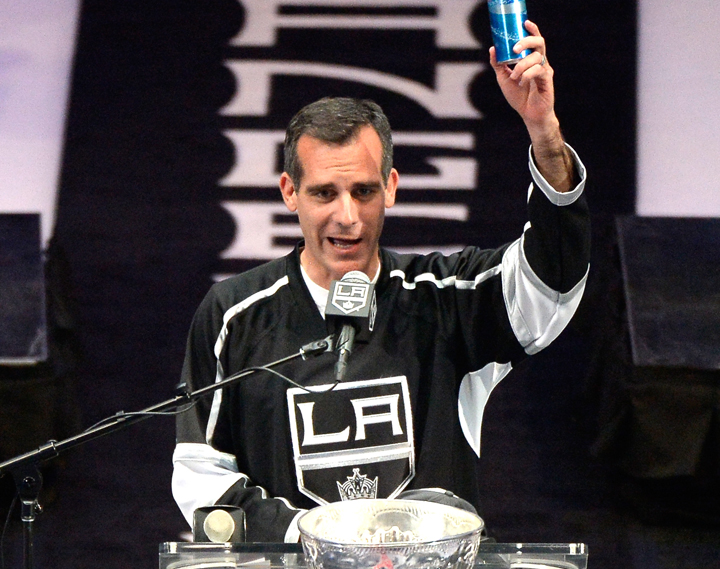 Having shed his pinstriped suit of choice for a hockey jersey, Garcetti stepped in front of TV cameras and some 19,000 people gathered at Staples Center, where the Kings won the Cup on Friday.