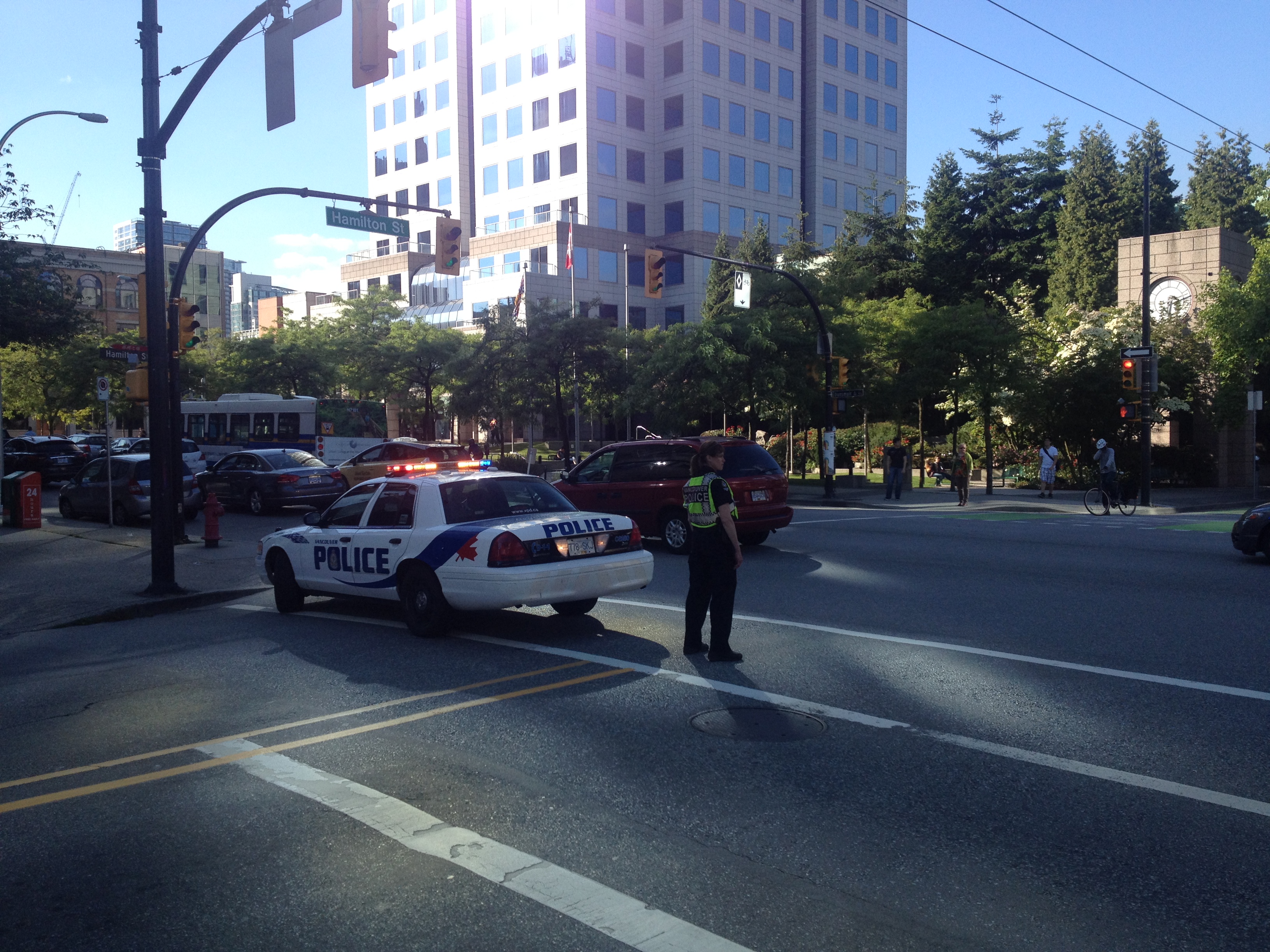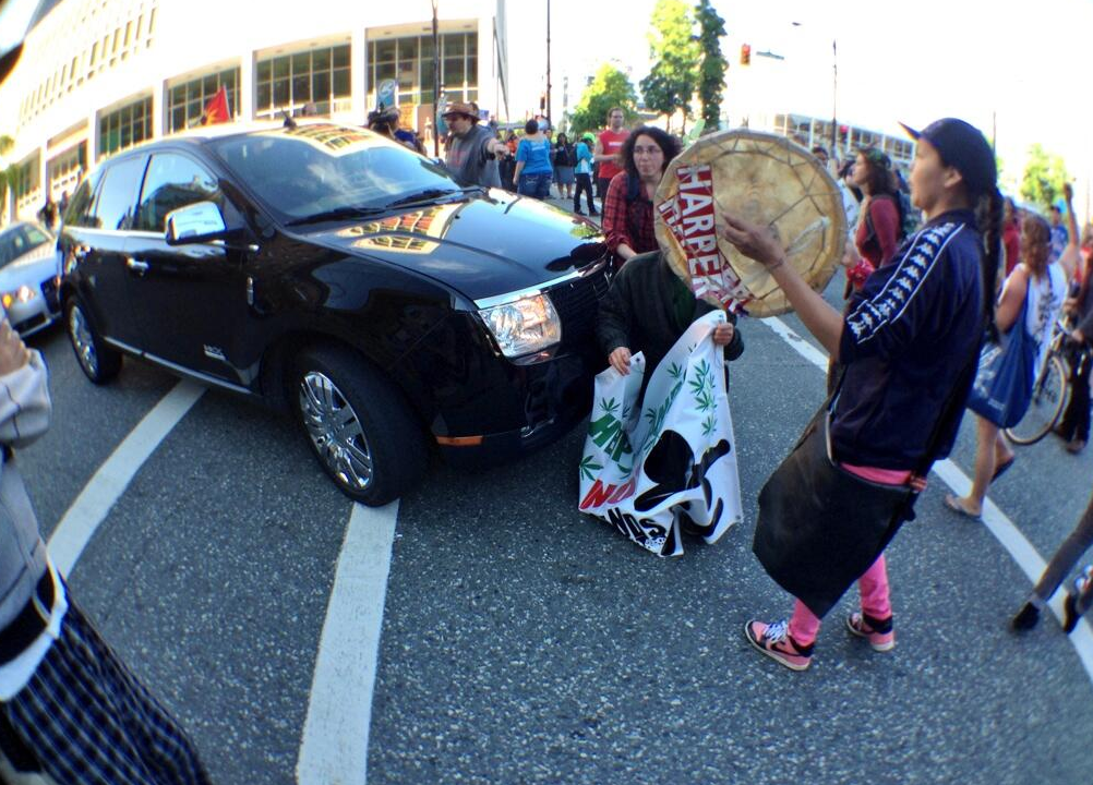 The demonstration closed West Georgia at Hamilton Street for about an hour and our Global News cameraman said some demonstrators were blocking cars as well. Traffic and transit in the area is being re-routed while the demonstration is going on.