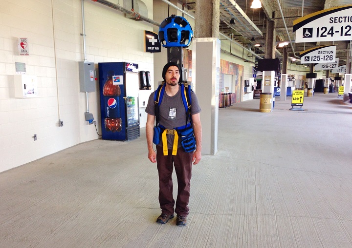 A Google employee wearing a towering camera contraption ran around Investors Group Field Wednesday, recording images of the facility that will eventually be accessible online — similar to the Google Street View feature that allows users to see neighbourhoods all over the world.