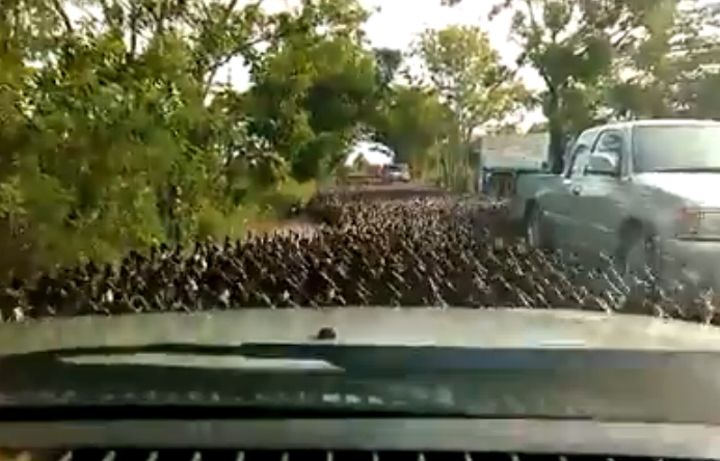 In the video, two people are heard discussing the mass flood of ducks as the stampede stopped traffic.