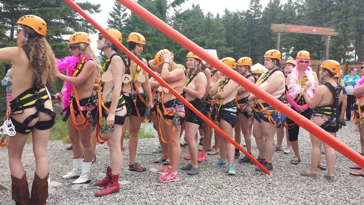 PEACHLAND, B.C. – With sometimes nothing more than a harness, helmet and running shoes, woman are gearing up today to traverse the fourth annual naked zip-line fundraiser.