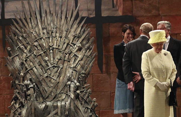 ABOVE: Will she, or won’t she? Queen Elizabeth visited the Game of Thrones set Tuesday, but disappointed fans of the HBO series by not sitting upon the show’s iconic “Iron Throne”