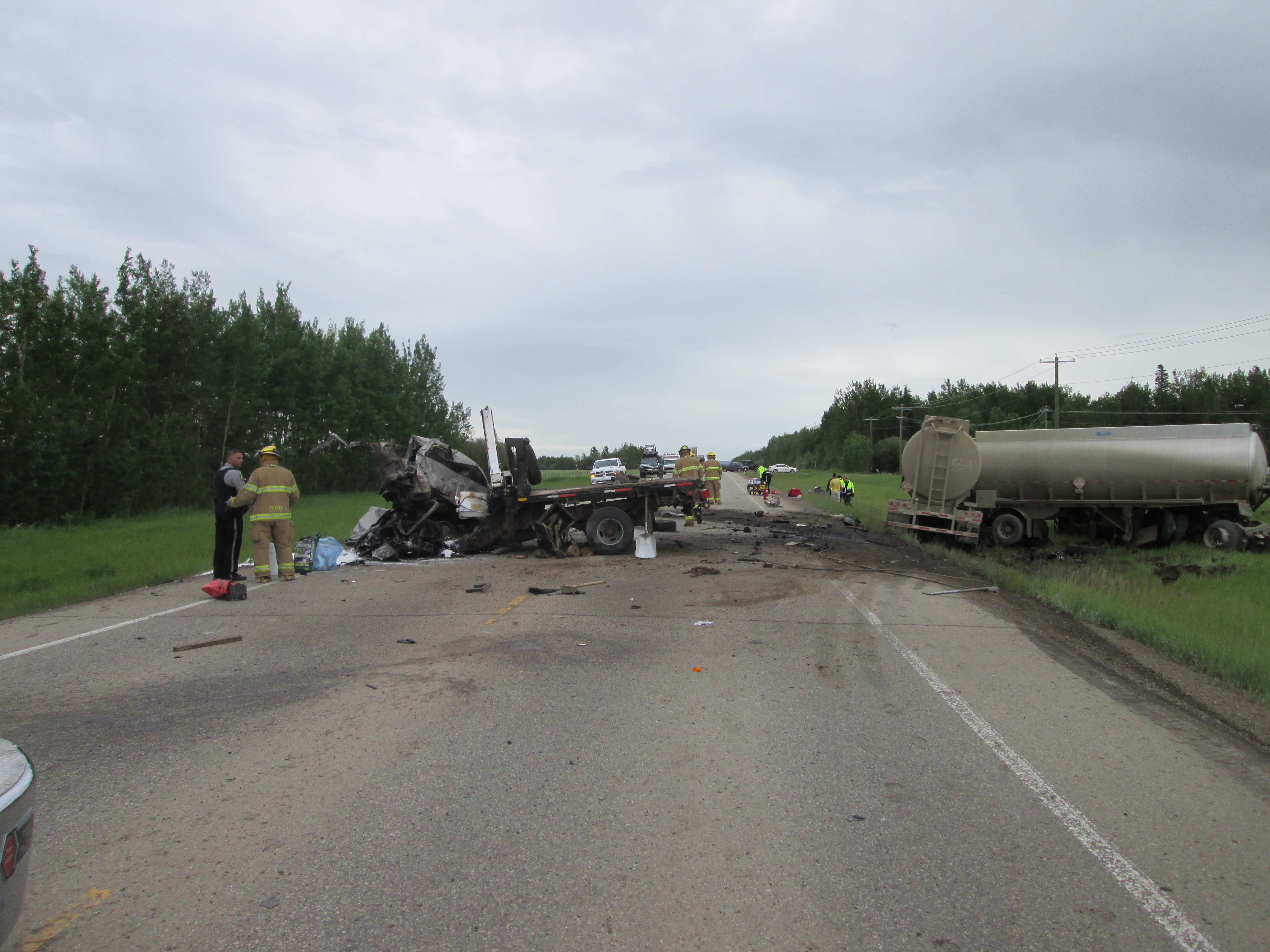 EDMONTON – A collision between a semi tanker truck and a picker truck has left one person dead.