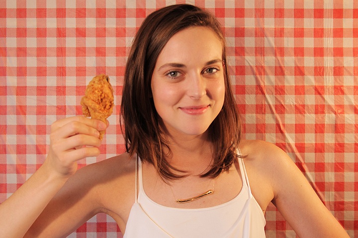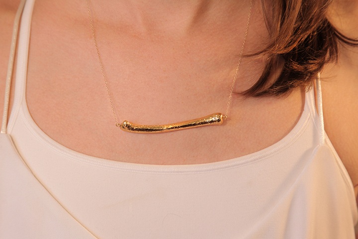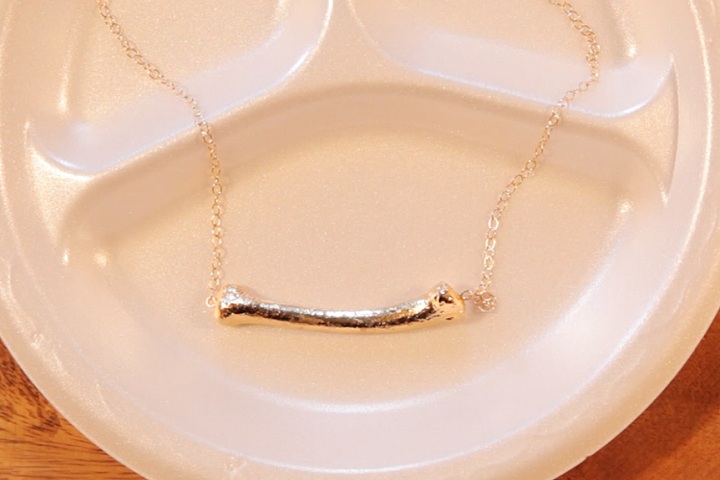 “You can rock your chicken bone with a pair of jeans and a t-shirt or your little black dress, that’s the great thing about gold, it makes any outfit look fabulous,” designer Meg C says of the necklace. “And don’t chicken bones just go with everything?”