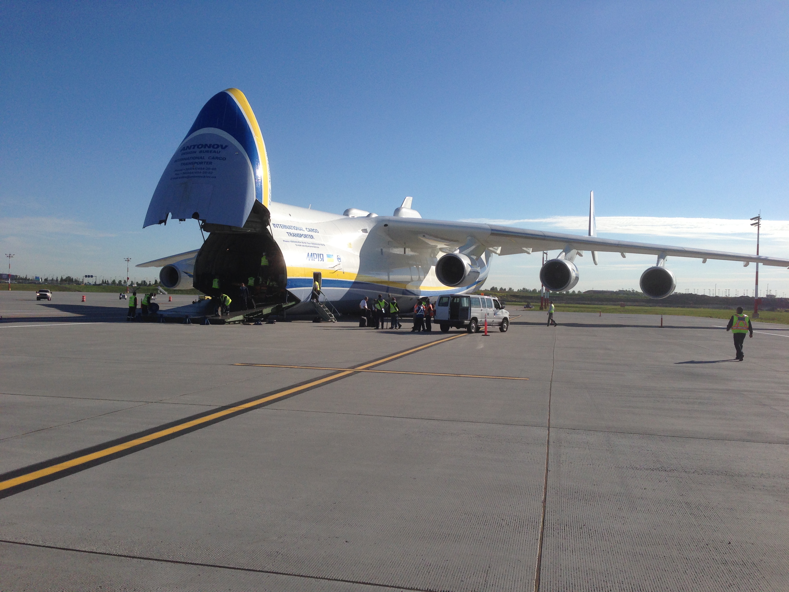 This is not the first time the An-225 has touched down in Edmonton. In March of 2010, the plane was chartered by the U.S. military to bring supplies from Edmonton-based Canadian Helicopters to Afghanistan. It picked up 50 tonnes of supplies, including three helicopters. In November of 2007, the plane delivered three armoured vehicles for military training.