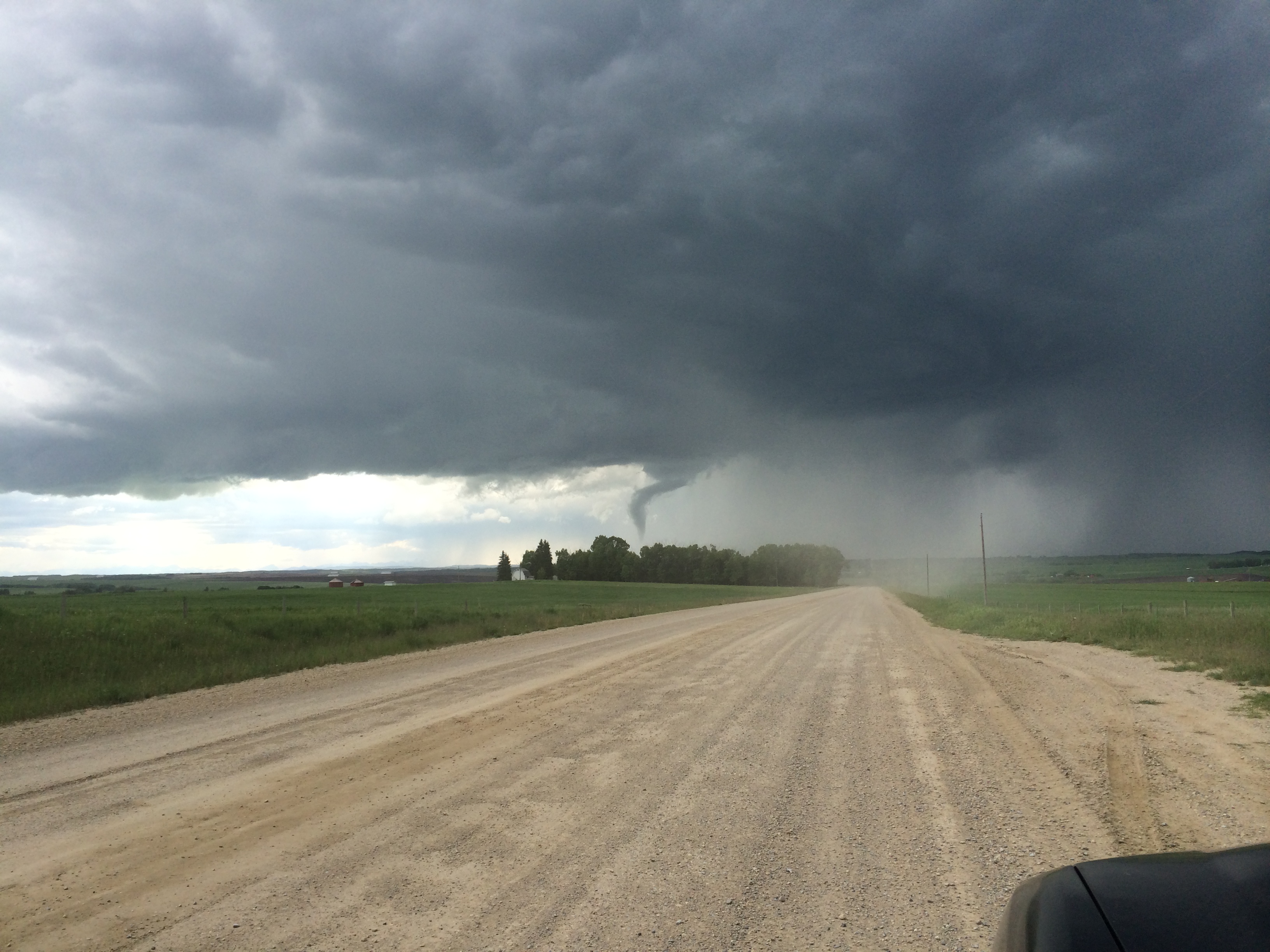 “At approximately 4:45 PM MDT on Friday June 27 a very brief tornado was observed 16 km south of Cremona. Multiple reports and photos were received. A dust cloud was seen at the base of the funnel, however, there were no reports of damage. The thunderstorm has since dissipated and no other tornadoes are expected.”
