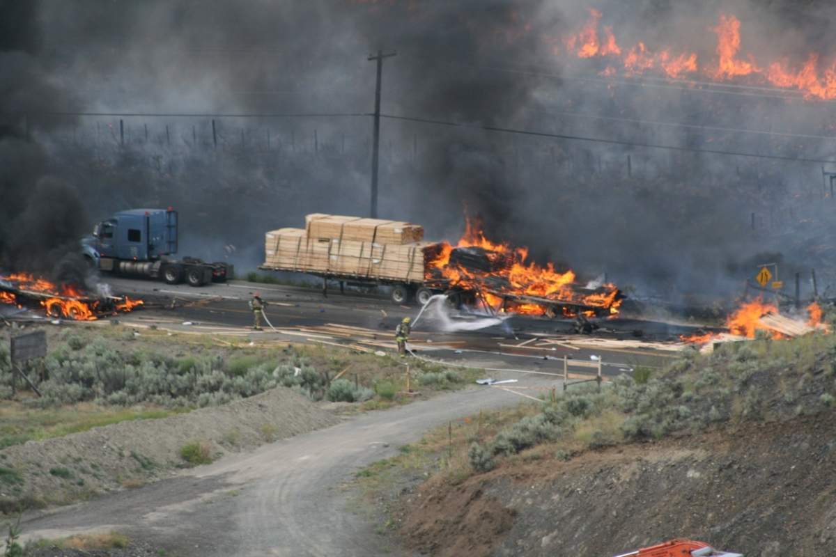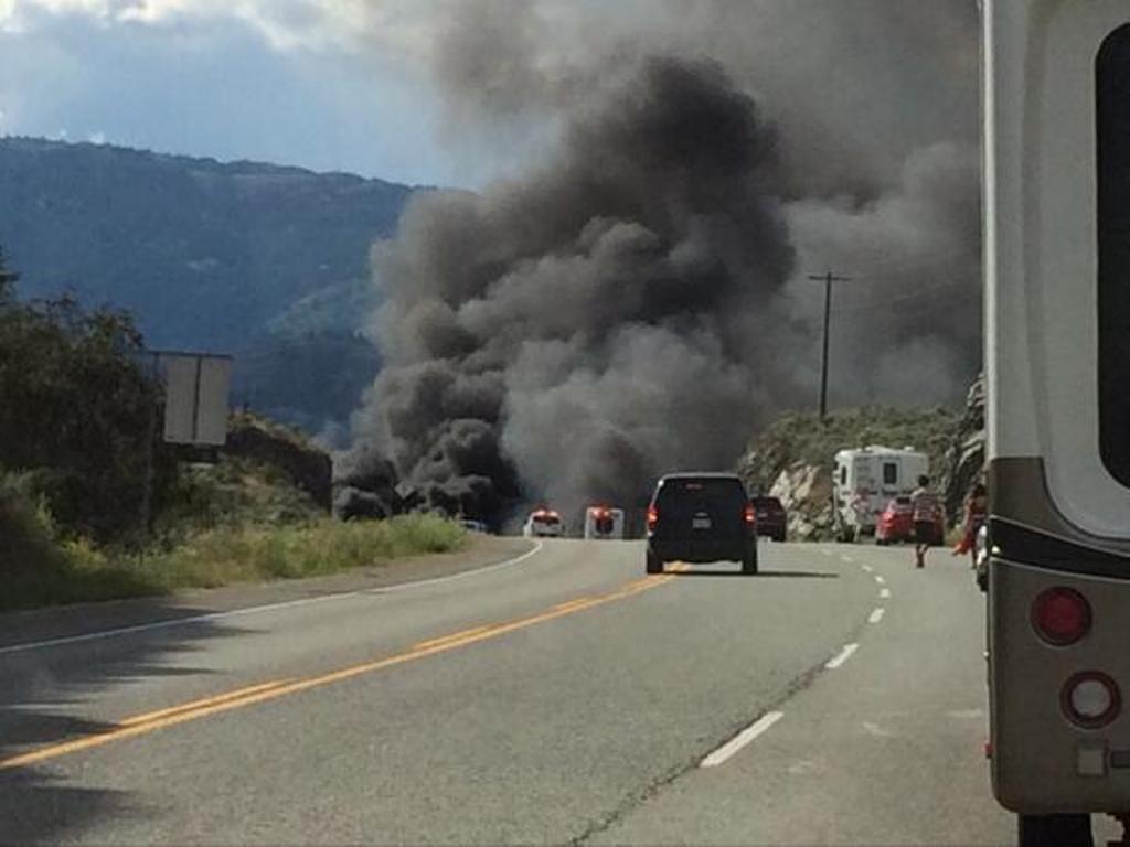 Traffic is now open to single lane alternating traffic nine kilometres west of Osoyoos, after a fiery crash just after 5 p.m. Wednesday.