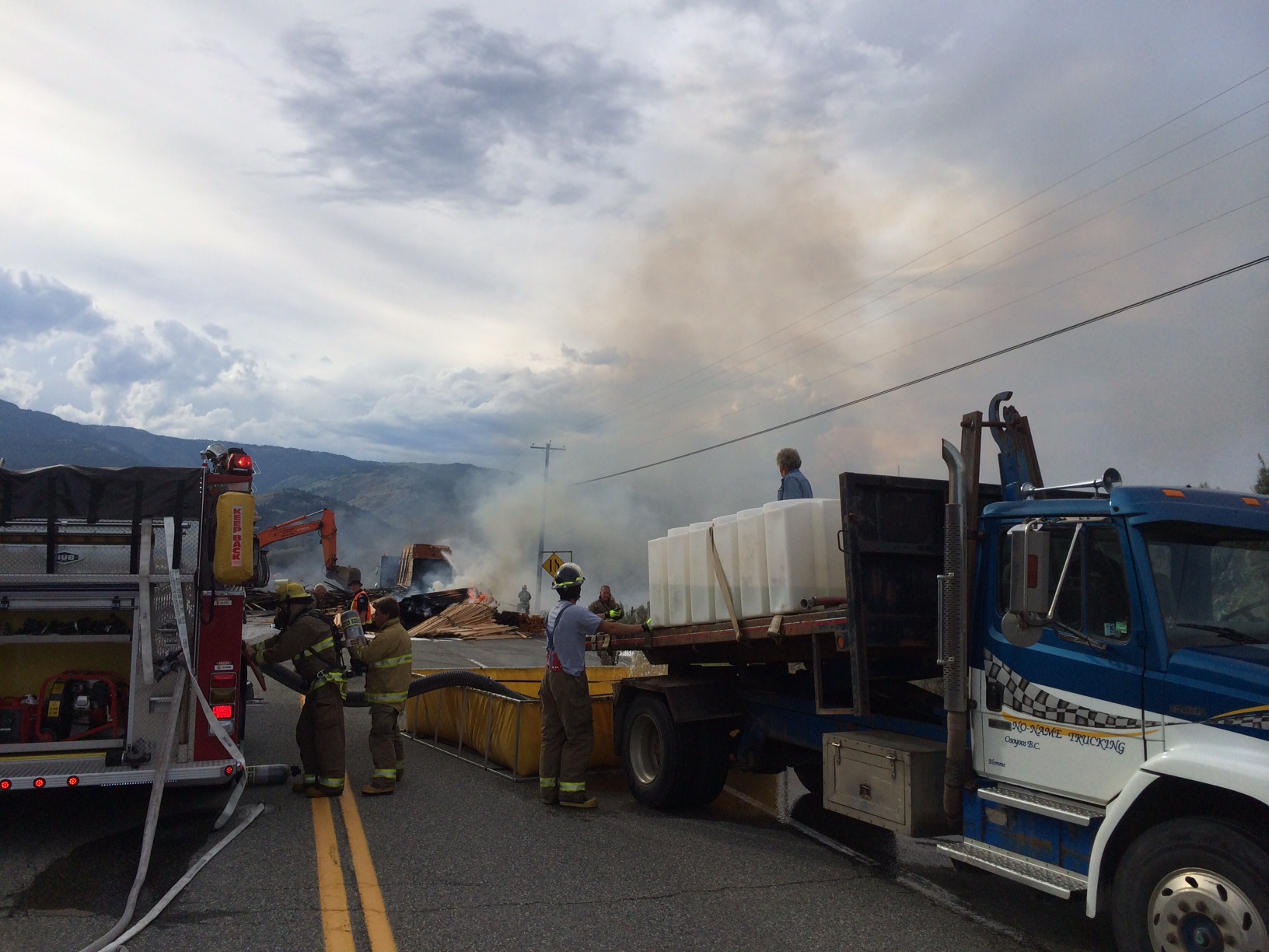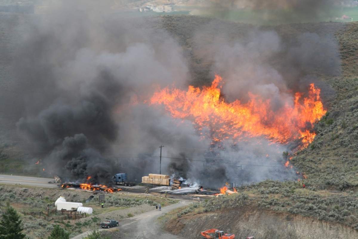 It’s believed one of the trucks was carrying lumber, which caused flames from the crash to spread to the nearby brush.